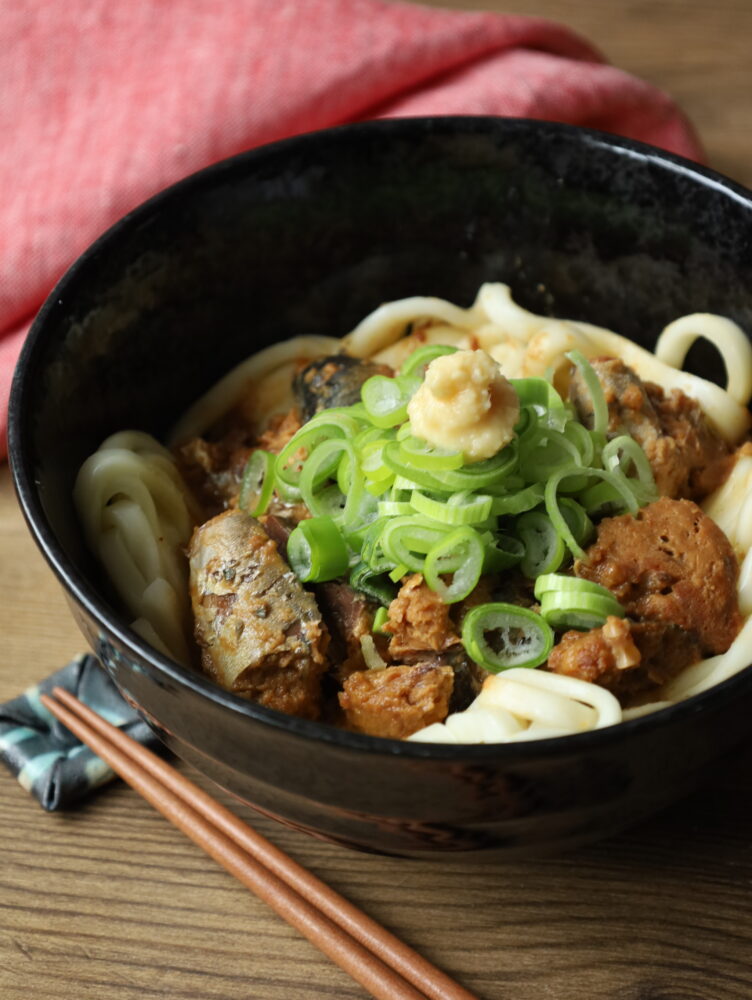サバ味噌煮缶を使ったうどんのレシピです。